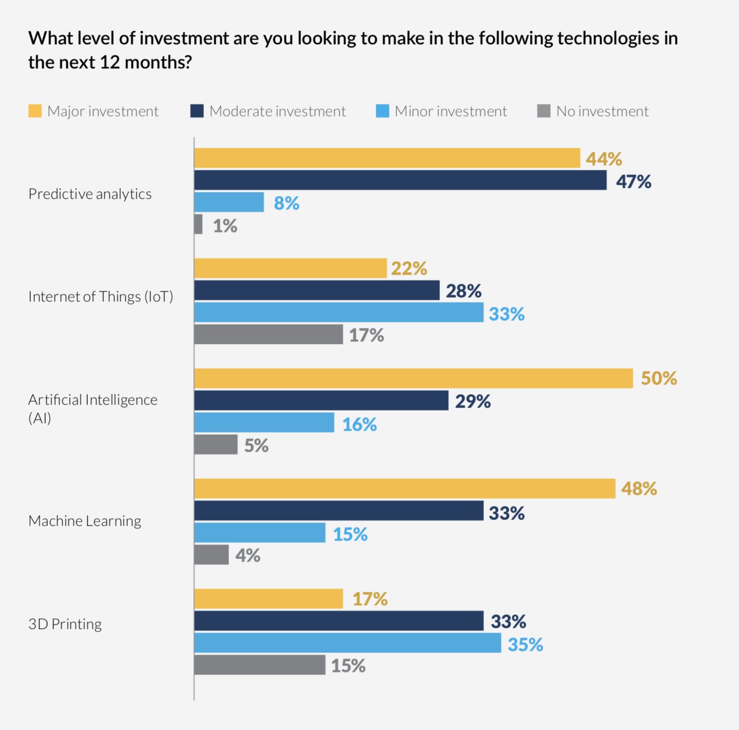 With only 22% of manufacturers responding that IoT will be a major investment in the next 12 months, it could be that the investment has already been made and the focus is more on the optimization of the data that IoT collects. In fact, millions of data points are already available from sensor equipped products in the field, and that number will only increase over time. The problem is: it’s impossible for a human – or even a team of humans – to sift through that data and act on it in a way that positively impacts their business.