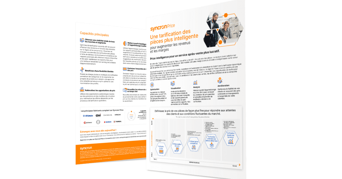 Syncron Price est une solution puissante conçue spécifiquement pour les fabricants, les revendeurs et les fournisseurs de l’industrie de l’après-vente. À l’aide d’algorithmes avancés d’intelligence artificielle et d’apprentissage automatique (machine learning), Syncron Price automatise et optimise les capacités de tarification dynamique à une échelle mondiale. Cette solution permet aux utilisateurs d’identifier les opportunités en matière de tarification qui passeraient autrement inaperçues, ce qui impacte de manière positive sur les performances de l’entreprise en augmentant les volumes de ventes, les recettes et la rentabilité des services. Avec Syncron Price, les entreprises de pièces de rechange peuvent prendre des décisions en matière de tarification basées sur les données qui stimulent la croissance et augmentent la rentabilité.