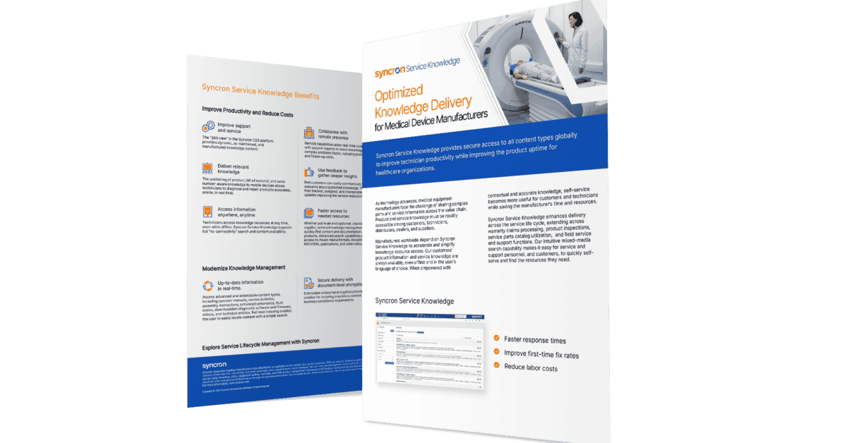 Syncron Service Knowledge provides secure access to all content types globally to improve technician productivity, while improving the product uptime for healthcare organizations. As technology advances, original equipment manufacturers face the challenge of sharing complex parts and service information across the value chain. Product and service knowledge must be readily accessible to customers, technicians, distributors, dealers, and suppliers. Simplify knowledge resource access with Syncron Service Knowledge.